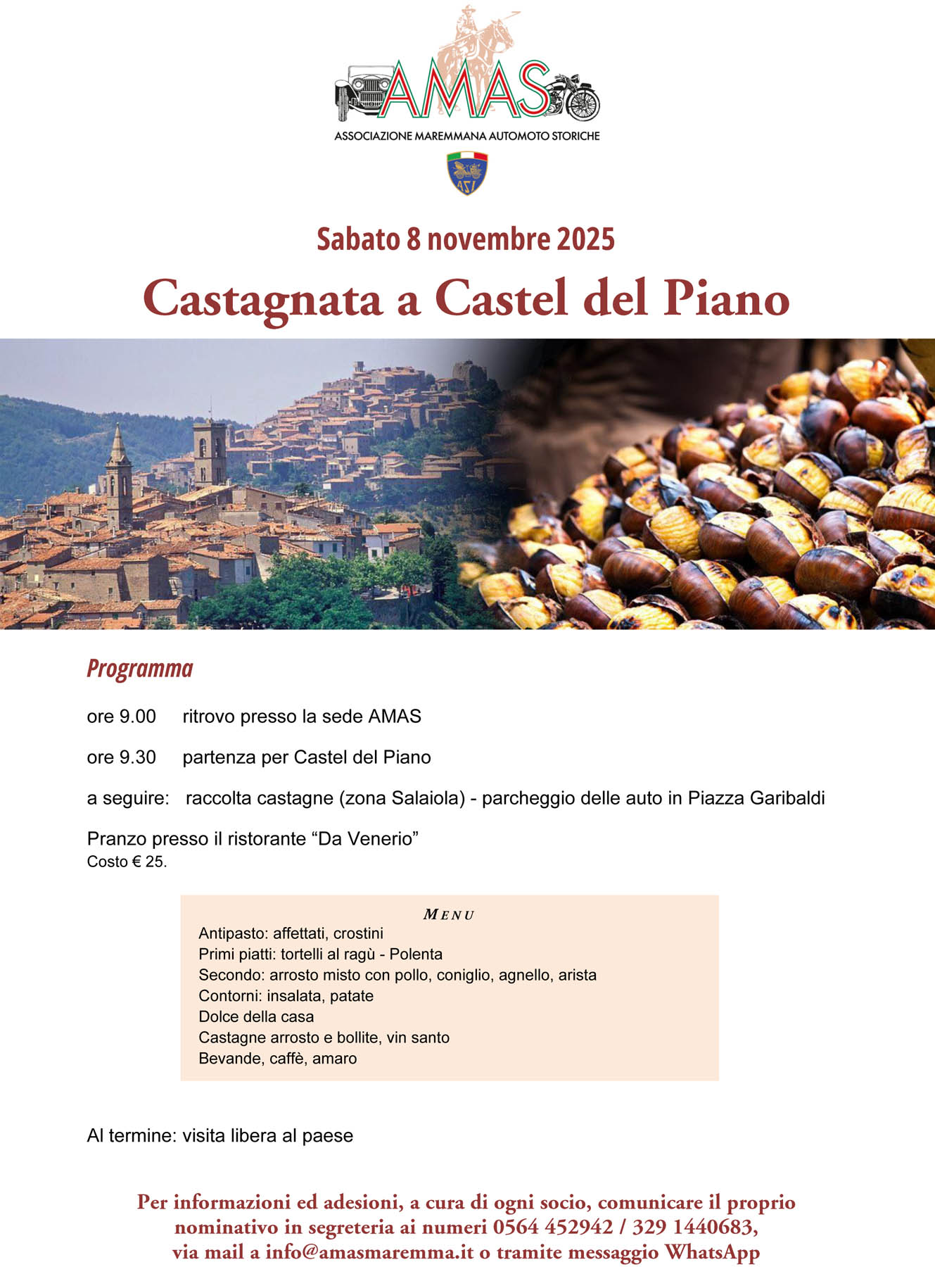 Per informazioni ed adesioni, a cura di ogni socio, comunicare il proprio nominativo in segreteria ai numeri 0564 452942 / 329 1440683, via mail a info@amasmaremma.it o tramite messaggio WhatsApp |